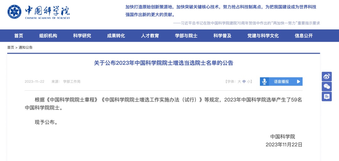 11月22日,中國科學(xué)院和中國工程院分別公布2023年兩院院士增選結果。中國科學(xué)院增選院士59人,中國工程院增選院士74人。