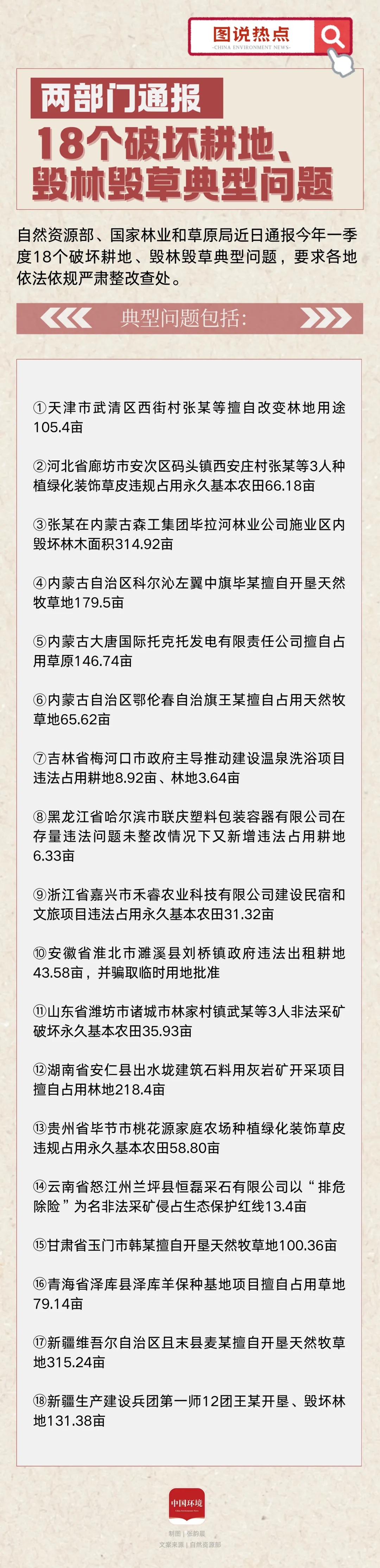 為切實(shí)發(fā)揮警示震懾作用,兩部門(mén)日前聯(lián)合通報18個(gè)破壞耕地、毀林毀草典型問(wèn)題。