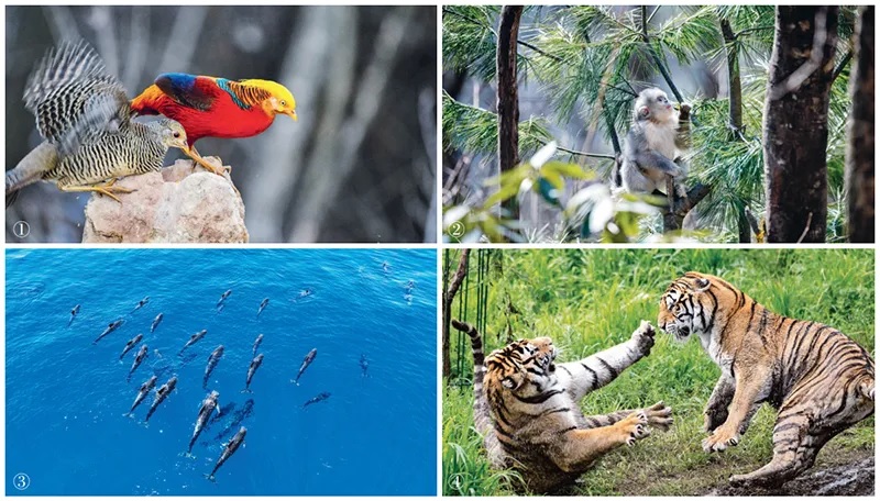 中國將生物多樣性保護上升為國家戰略,取得顯著(zhù)成效,為世界提供共建地球生命共同體的中國方案。圖①為湖北神農架林區棲息的鳥(niǎo)類(lèi)(中新社發(fā) 喻杰/攝)。圖②為在云南白馬雪山國家級自然保護區拍攝的滇金絲猴(新華社記者 胡超/攝)。圖③為一群短肢領(lǐng)航鯨在海南島東部海域暢游(新華社記者 張麗蕓/攝)。圖④為在黑龍江東北虎林園拍攝的東北虎(新華社記者 張濤/攝)。