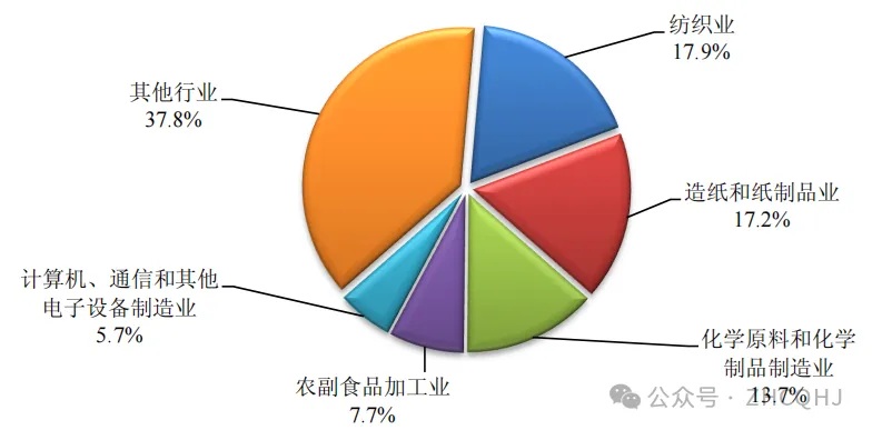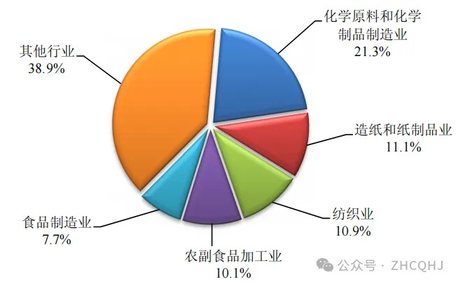 在統計調查的42個(gè)工業(yè)行業(yè)中,化學(xué)需氧量排放量排名前五的行業(yè)依次為紡織業(yè),造紙和紙制品業(yè),化學(xué)原料和化學(xué)制品制造業(yè),農副食品加工業(yè),計算機、通信和其他電子設備制造業(yè)。