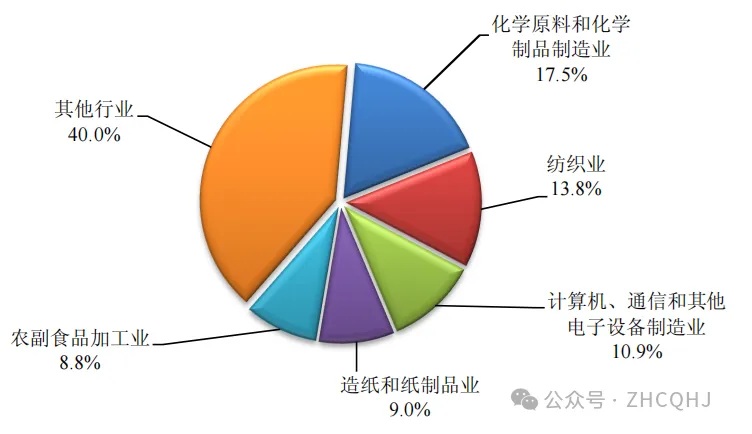 在統計調查的42個(gè)工業(yè)行業(yè)中,總氮排放量排名前五的行業(yè)依次為化學(xué)原料和化學(xué)制品制造業(yè),紡織業(yè),計算機、通信和其他電子設備制造業(yè),造紙和紙制品業(yè),農副食品加工業(yè)。