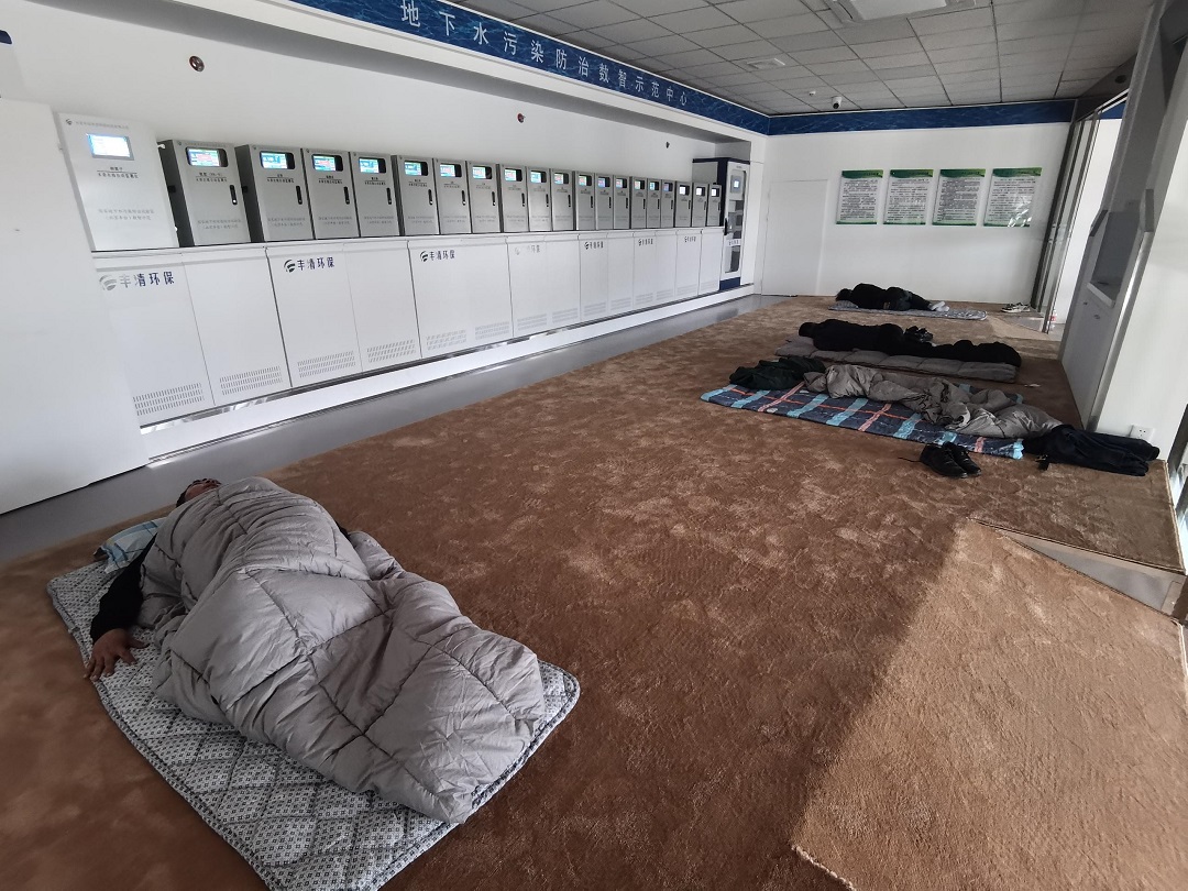 在與大風(fēng)沙塵激烈“對抗”的兩天兩夜中,抗風(fēng)團隊成員如同忠誠的衛士,輪流值班,毫不懈怠。風(fēng)力稍小時(shí),他們如警惕的巡邏兵,在周邊仔細巡邏檢查;風(fēng)力強勁時(shí),便化身“安全守護使者”,著(zhù)重檢查中心門(mén)窗安全。困了,就臨時(shí)打地鋪稍作休憩,即便在短暫的休息時(shí)刻,他們也始終保持高度警惕,將人員和設備安全奉為至高無(wú)上的準則。