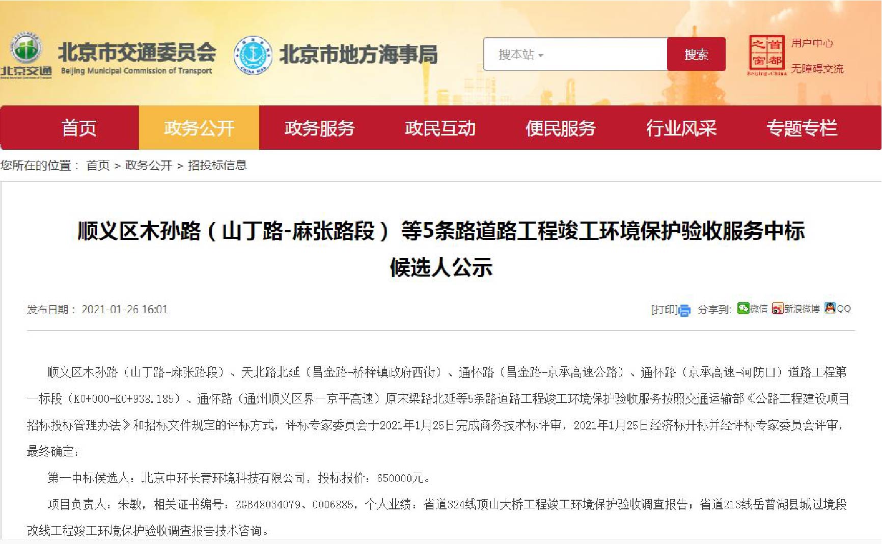 2021年2月1日,經(jīng)過(guò)與多家環(huán)保公司的激烈競標,北京中環(huán)長(cháng)青成功中標北京市交通委員會(huì )順義公路分局“順義區木孫路(山丁路-麻張路段)、天北路北延(昌金路-橋梓鎮政府西街)、通懷路(昌金路-京承高速公路)、通懷路(京承高速-河防口)道路工程第一標段(K0+000-K0+938.185)、通懷路(通州順義區界—京平高速)原宋梁路北延等 5 條路道路工程竣工環(huán)境保護驗收服務(wù)”項目。