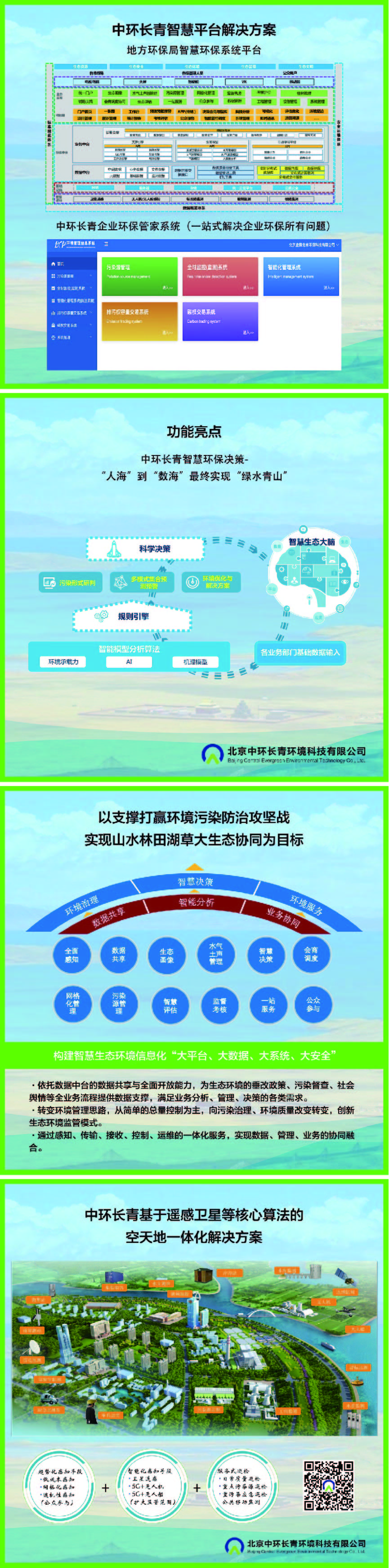 目前中環(huán)長(cháng)青環(huán)境管理信息平臺覆蓋有“區域空氣環(huán)境質(zhì)量(無(wú)組織排放智慧監測及管控)、水環(huán)境服務(wù)(河流水質(zhì)污染監測分析、黑臭水體監測、污染源分部監測、飲用水水源地保護區域遙感動(dòng)態(tài)變化監測、湖庫型水源地富養營(yíng)養化動(dòng)態(tài)變化監測等)、區域環(huán)境特征物污染溯源服務(wù)(溯源污染成分分布監測、區域時(shí)空污染分布規律分析、當量企業(yè)污染排放分布圖和量化排名、外來(lái)輸入性污染傳輸通道分析、大氣污染應急響應評估、大氣污染成因分析與污染源治理管控措施、大氣污染氣團軌跡分析、重點(diǎn)污染區域監測等)、城市固廢監測及提取服務(wù)、城市綠化管理監測服務(wù)、地災遙感監測”等行業(yè)領(lǐng)先的技術(shù)服務(wù)。