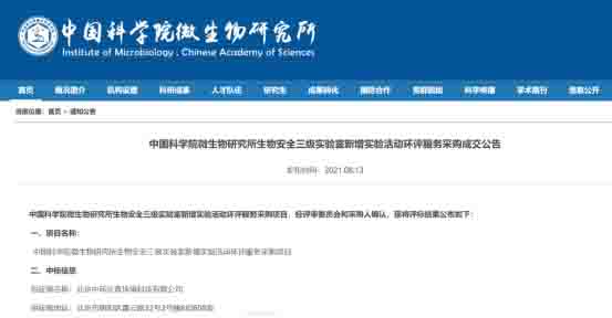 2021年8月13日,北京中環(huán)長(cháng)青環(huán)評團隊中標中國科學(xué)院微生物研究所生物安全三級實(shí)驗室新增實(shí)驗活動(dòng)環(huán)評服務(wù)采購項目。這是繼P3實(shí)驗室環(huán)保驗收等項目之后的又一次合作。