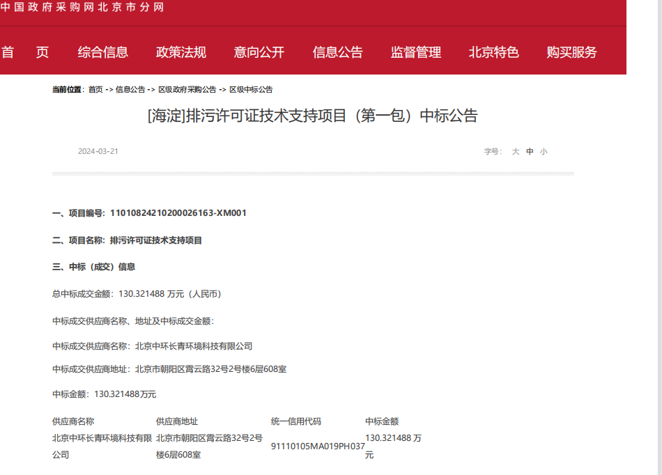 2024年3月15日,北京中環(huán)長(cháng)青環(huán)境科技有限公司(以下簡(jiǎn)稱(chēng)中環(huán)長(cháng)青)參加了北京市海淀區生態(tài)環(huán)境局組織的排污許可證技術(shù)支持項目的招事宜,按照要求遞交了投標響應文件,經(jīng)過(guò)評標專(zhuān)家委員會(huì )的審查、評比,最終確定北京中環(huán)長(cháng)青環(huán)境科技有限公司為中標方。