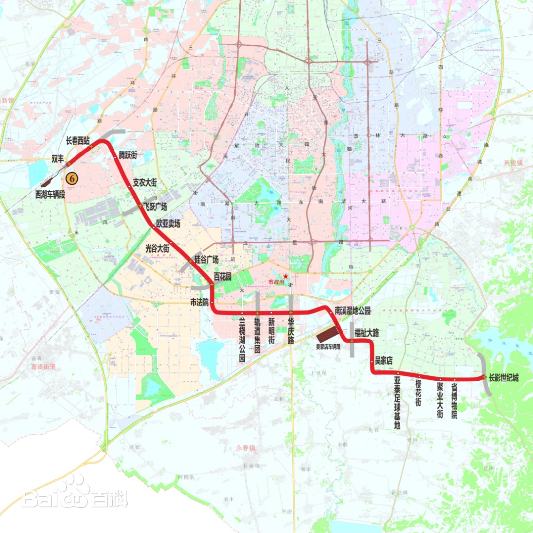 長(cháng)春地鐵6號線(xiàn)線(xiàn)路全長(cháng)29.602千米,全線(xiàn)共設置車(chē)站22座,其中換乘站9座,全部為地下站,平均站間距1388米;全線(xiàn)設置吳家店車(chē)輛段一座,西湖停車(chē)場(chǎng)與2號線(xiàn)西湖車(chē)輛段共址。工程采用標準B型車(chē),初、近、遠期均采用6輛編組,設計最高行車(chē)速度80千米/小時(shí),工程總投資217億元。
